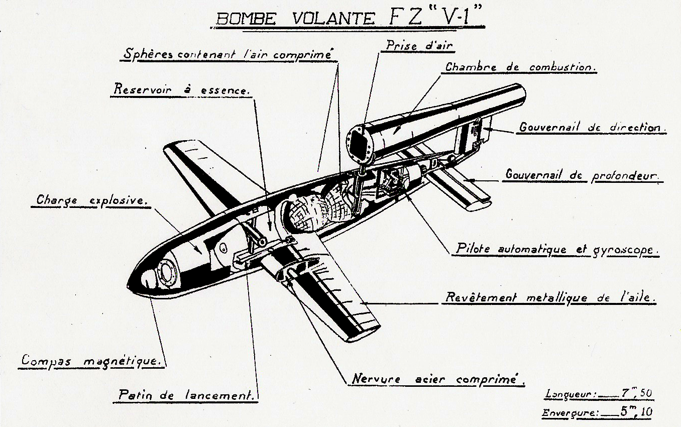 lancement. D’une portée de 350 kilomètres, les V1 et leurs bases étaient à la merci d’un raid éclair à tout moment du jour ou de la nuit. Pour avoir un effet psychologique plus grand au début de l’offensive, les tirs étaient de nuit. Le temps de vol était calculé par une hélice située à l’avant de la bombe qui avait un compte tours programmé. A la fin du décompte, le moteur se coupait, les ailerons de profondeur se bloquaient en piqué et la dérive en virage serré, faisait basculer le V1 jusqu’au point d’impact. La précision avait plusieurs kilomètres de dispersement. Cet inconvénient fut la raison du manque de résultat des attaques sur les objectifs choisis par les Allemands.