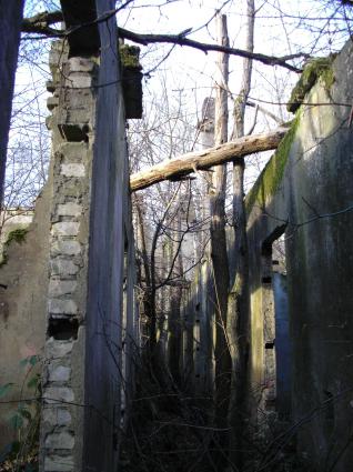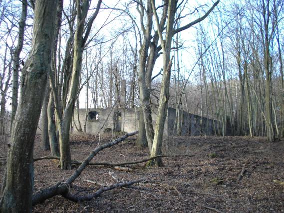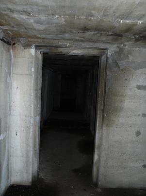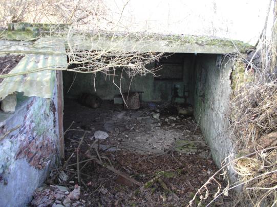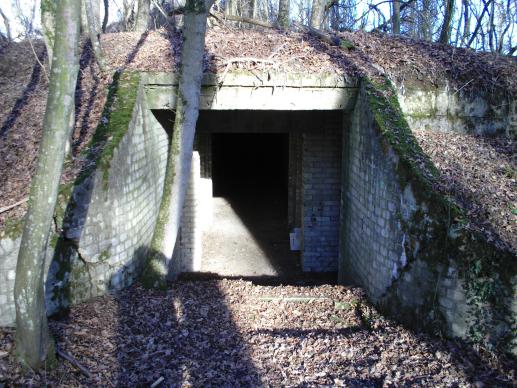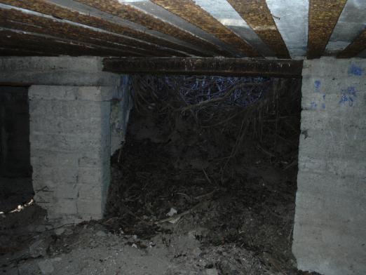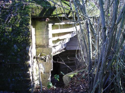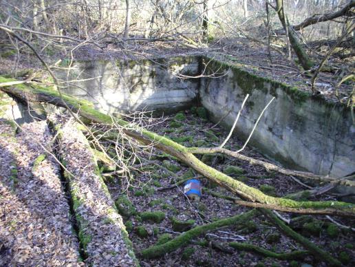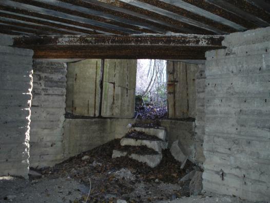 En bas : l’entrée remblayée du bunker avec un aperçu sur le plafond fait de poutrelles métalliques.