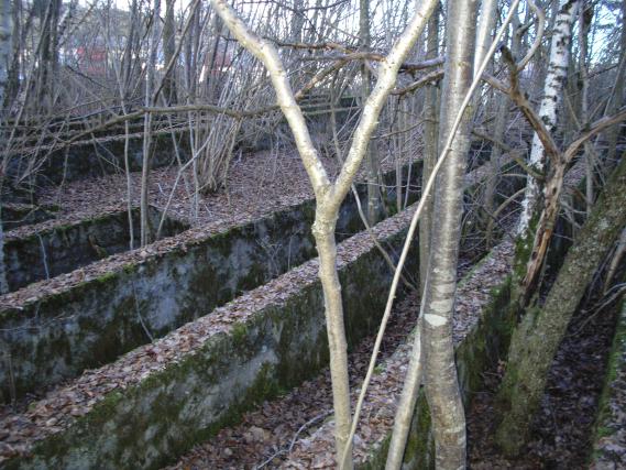 * En haut gauche : abri anti-aérien « bunker Liesel » sûrement une construction 14-18. En haut à droite : fondation des baraquements formant l’autre hôpital. Au milieu : ruine des bâtiments techniques. Ci-dessus à gauche : le relais St Marie avec sa tour d’observation, qui servait aussi au séchage des parachutes et comme poste de mitrailleuse. Ci-dessus droite : bunker anti-aérien avec une tour pour projecteur de 60 cm.