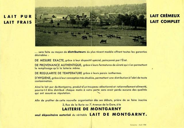 Déjà, dans les années 1900, à Montgarny, le lait est produit en vue de la vente directe à la consommation. C’est pourquoi, après chaque traite, le lait est filtré, refroidi, mis en bouteilles cachetées et immédiatement expédié à Soissons où il est distribué à domicile par les soins d’un service spécial, dépendant de l’exploitation. Déjà à cette époque, tout est mis en œuvre afin d’assurer la production du lait dans des conditions optimales d’hygiène. Ainsi, aucune vache n’entre à la ferme sans avoir été, au préalable, soumise, en quarantaine, à l’épreuve de la tuberculine et à l’examen d’un vétérinaire. A tel exemple que c’est à Montgarny que s’adressent les hôpitaux de Soissons pour leurs besoins quotidiens.